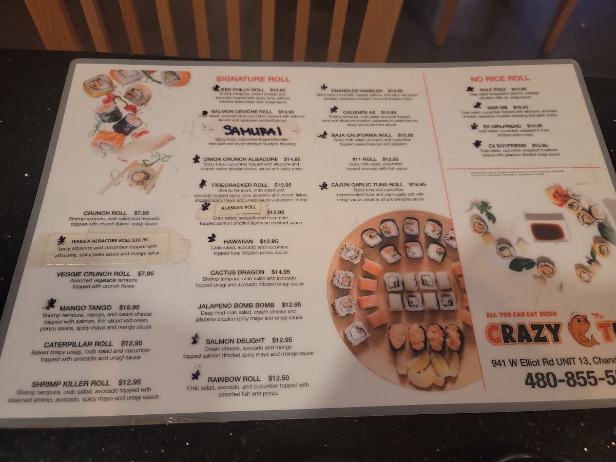 Located at 941 W Elliot Rd in Chandler, AZ, Crazy Tuna Sushi offers a delightful experience for sushi lovers. Their menu celebrates freshness and flavor, ensuring each dish is a treat for the palate. Customers rave about the quality of fish, with standout options such as the salmon sashimi and Cajun-inspired salmon nigiri, both receiving high praise. The all-you-can-eat format adds excitement, though certain items are thoughtfully limited to ensure quality, fostering a sense of culinary adventure.